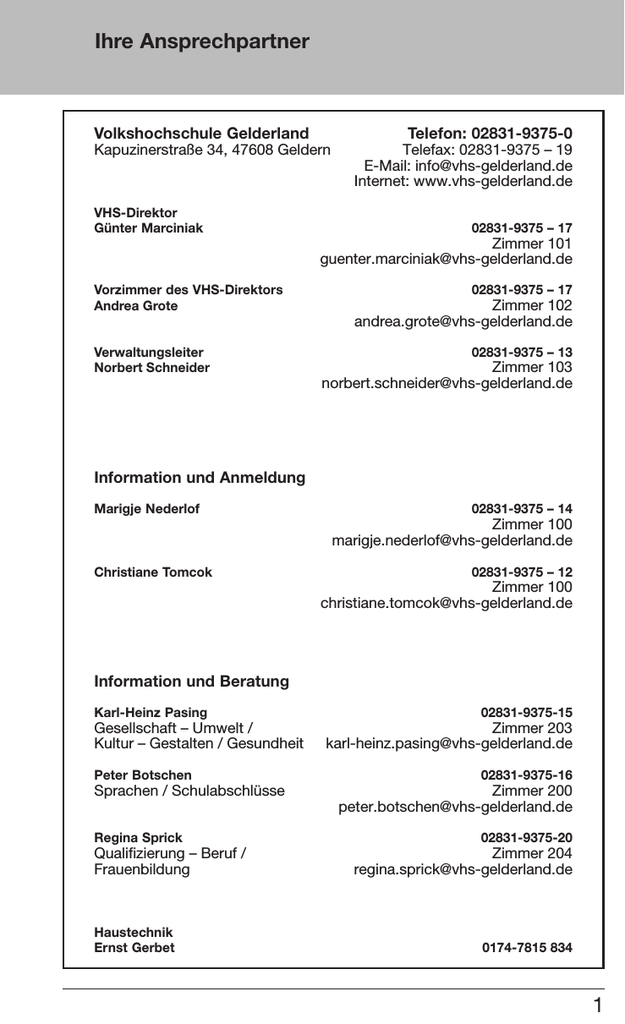 Ihre Ansprechpartner Volkshochschule Gelderland Telefon