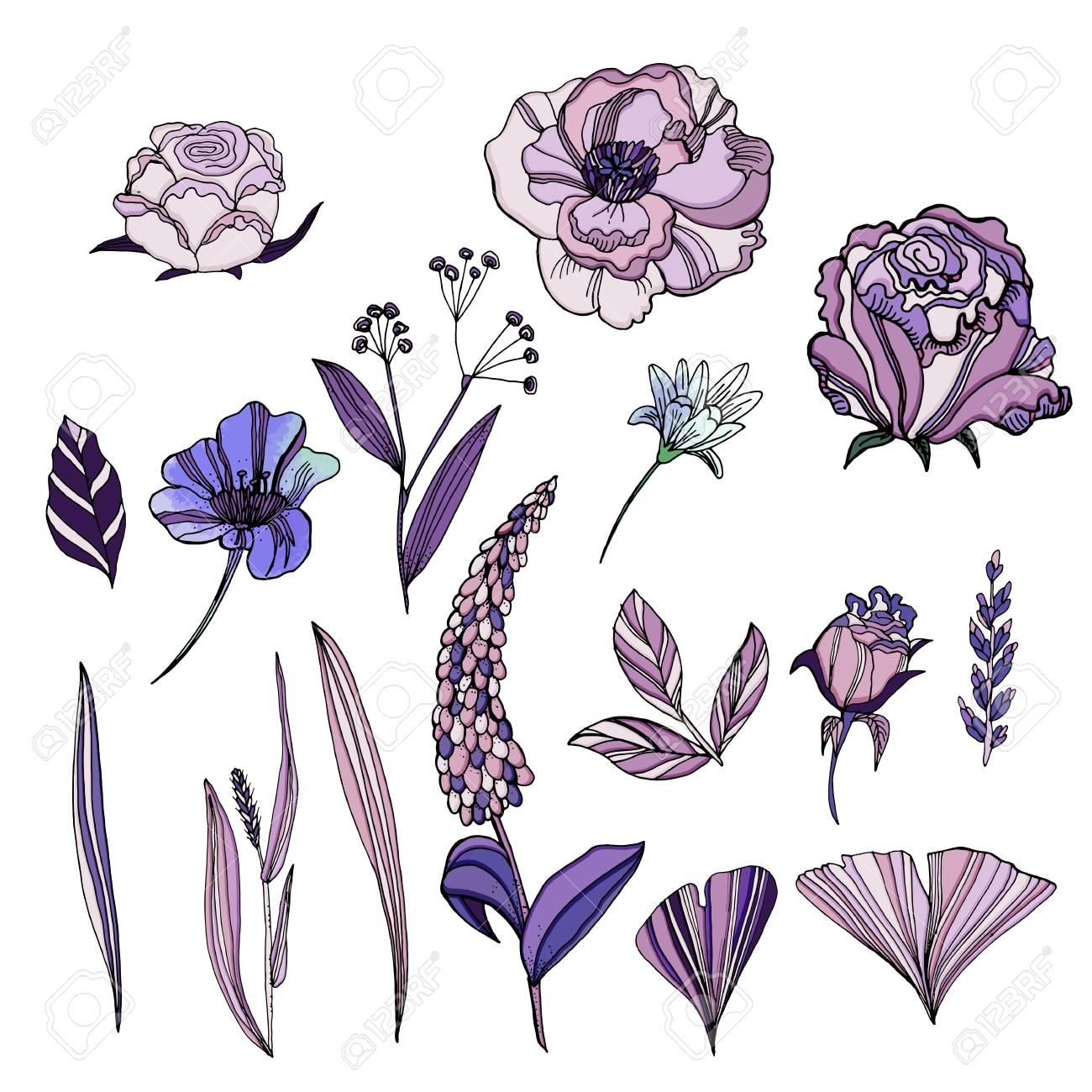 Vector Set Of Cute Hand Drawn Flowers Roses Violets Ranunculus