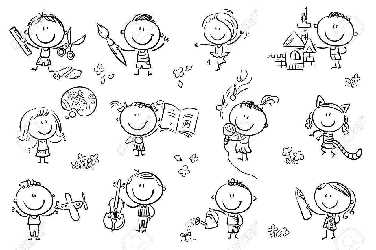 Funny Cartoon Kids Engaged In Different Creative Activities Like